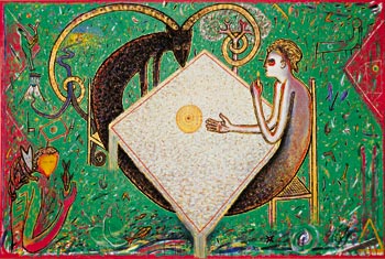 Face à face, attablés, un homme et un animal. Le premier tient une bougie dans une main et de l'autre désigne une assiette au centre de la table carrée. Le second, en rapport direct avec la nature, entoure par ses cornes les symboles complémentaires que sont la jonction des fleuves et le tronc d'un arbre. En regardant bien, on s'aperçoit qu'ils ne forment qu'une seule entité, un individu à la fois humain et animal, en même temps séparés et ré-unis par la table... Tout un mystère essentiel est mis en place. A chacun de voir comment il peut l'aborder.